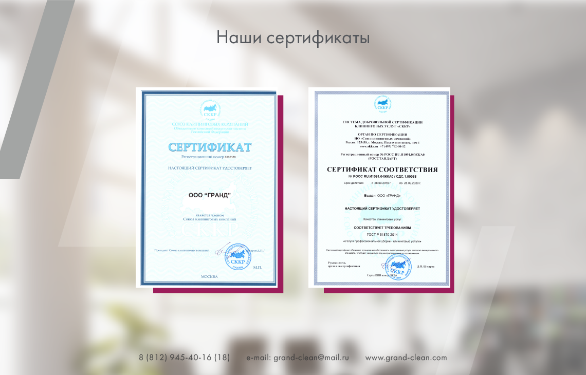 Компания «ГРАНД» оказывает услуги по профессиональной уборке помещений и прилегающих территорий в Санкт-Петербурге и регионах России с 2012 года юридическим и физическим лицам.